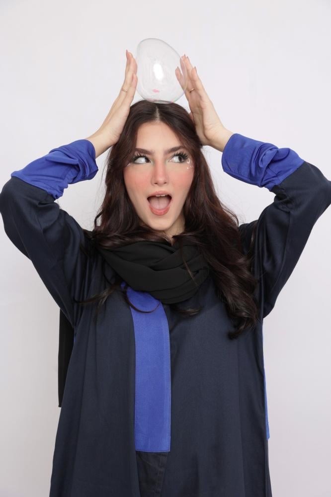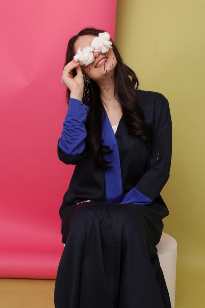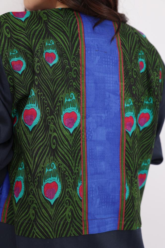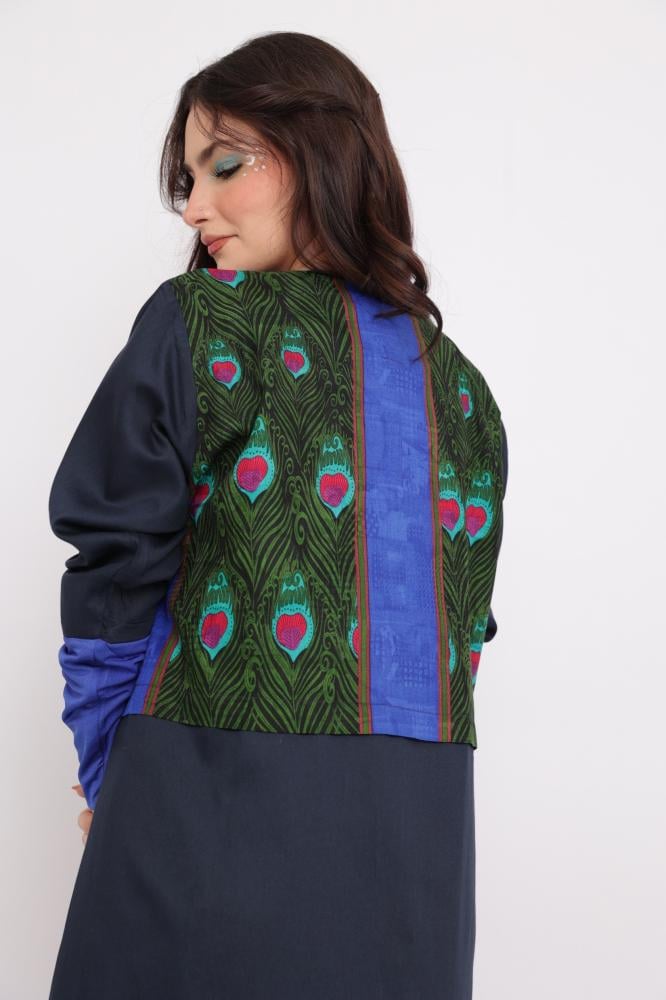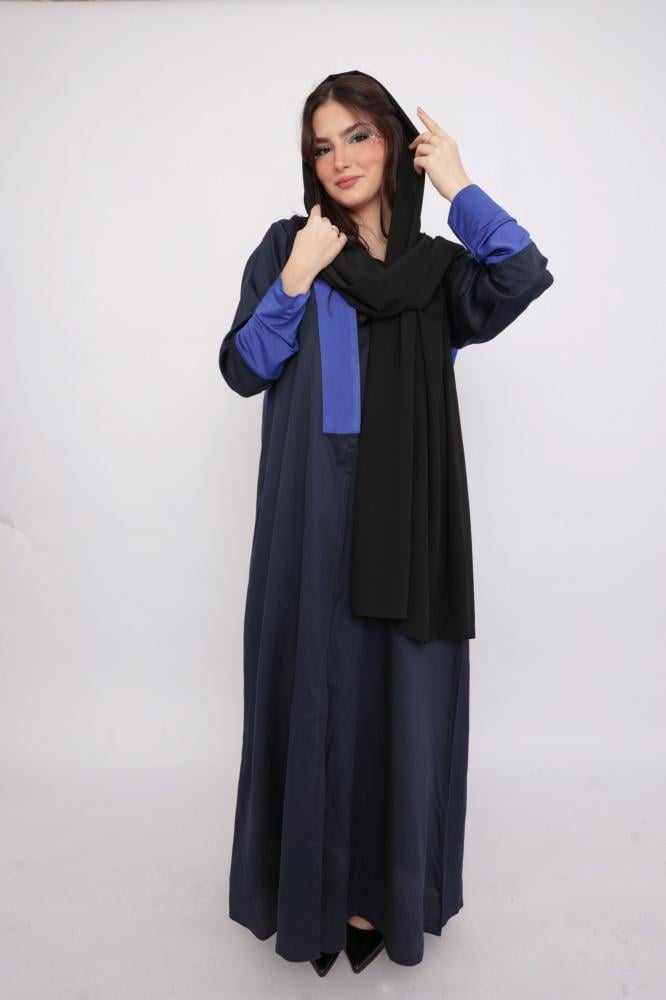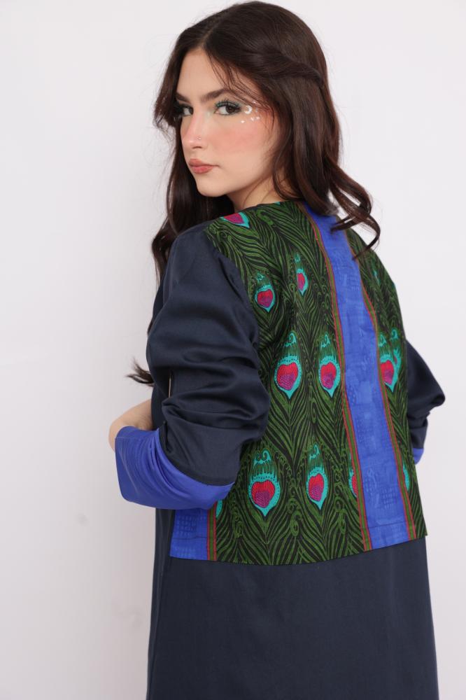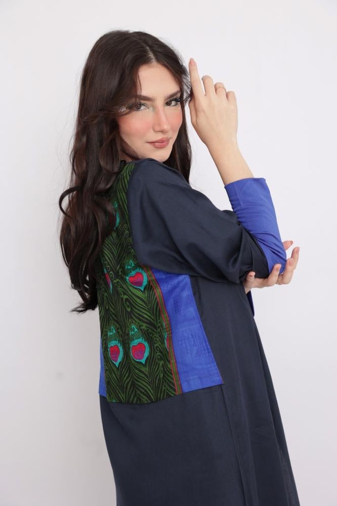 مصممة من قماش قطن كحلي غامق مع سترتش كحلي ناصع في الأكمام وطرف العباية تضيف عمق وأناقة للعباية، ومزينة بسديري من الخلف برسمة ريش الطاووس بألوان تكسر الرتابة.